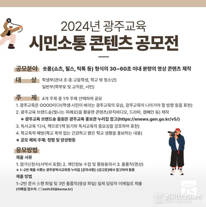 [ 한국미디어뉴스 기자 ] 광주시교육청은 오는 8~26일 교육가족과 시민이 함께하는 ‘2024 광주교육 시민소통 콘텐츠 공모전’을 실시한다.