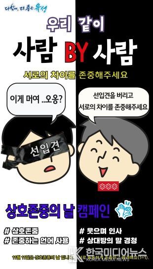 캠페인에는 정용래 구청장과 공무원 노동조합 임원들이 함께 참여해 출근하는 직원들에게 장미꽃을 나눠주며 ‘서로의 차이를 존중해주세요’라는 메시지를 전달했으며, ‘선입견’이라는 문구가 적힌 안대를 착용한 사람의 모습이 담긴 포스터를 청사에 게시해 ‘편견을 버리고 서로의 차이를 존중하며 인정하자’는 실천 의지를 다졌다.