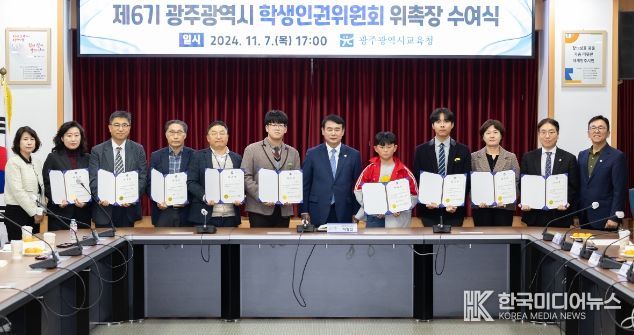 [ 한국미디어뉴스 기자 ] 광주시교육청은 지난 7일 중회의실에서 ‘제6기 광주광역시 학생인권위원’에 대해 위촉장을 수여했다.