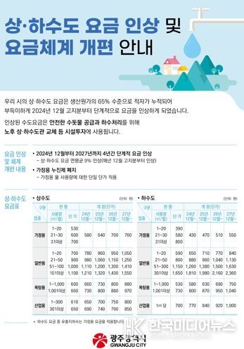 [ 한국미디어뉴스 기자 ] 광주광역시는 상·하수도 요금을 2024년 12월 고지분부터 4년간 연 9%(월평균 상수도 800원, 하수도 560원) 인상한다.