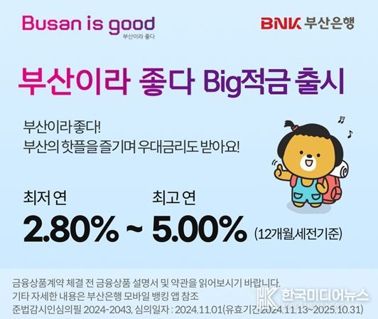[ 한국미디어뉴스 이원영 기자 ] 부산시는 비엔케이(BNK)부산은행과 함께 부산의 주요 관광지 등을 여행하는 재미와 함께 높은 금리를 제공하는 '부산이라 좋다 빅(Big)적금'을 출시한다고 밝혔다.