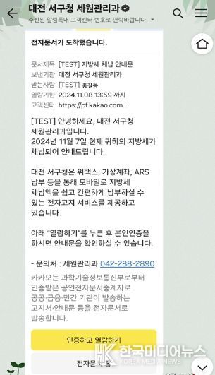 [ 한국미디어뉴스 기자 ] 대전 서구가 오는 18일부터 4일간 지방세 체납고지서 및 납부 안내문을 카카오톡을 통해 모바일 전자문서로 발송한다.