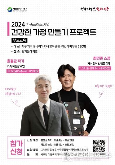 [ 한국미디어뉴스 기자 ] 대전 서구는 오는 22일과 29일 저녁 7시, 관저동에 위치한 관저문예회관에서 부모 및 예비 부모를 대상으로 건강한 가정 만들기 특별 강연을 개최한다.