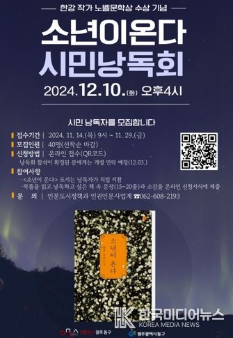 [ 한국미디어뉴스 기자 ] 광주 동구는 오는 12월 10일 오후 4시 동구 인문학당에서 열리는 ‘소년이 온다‘ 낭독회에 참여할 시민들을 모집한다고 밝혔다.