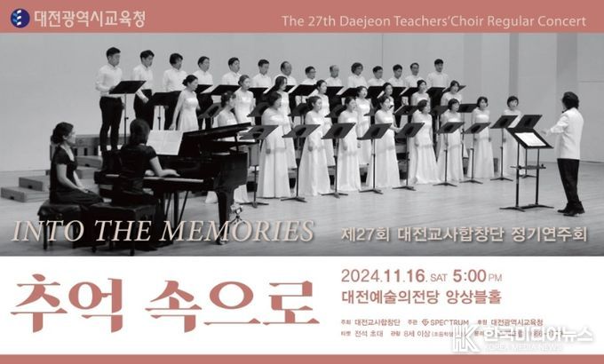 [ 한국미디어뉴스 기자 ] 대전시교육청은 소속 교원 및 퇴임 교원들로 구성된 대전교사합창단이 오는 11월 16일 오후 5시 대전예술의전당 앙상블홀에서 제27회 정기연주회 ‘추억 속으로'를 개최한다고 밝혔다. 이번 공연은 대전 시민을 위해 친숙하면서도 따뜻한 기억을 떠올릴 수 있는 곡들로 구성되어 누구나 쉽게 즐길 수 있는 무대를 제공할 예정이다.