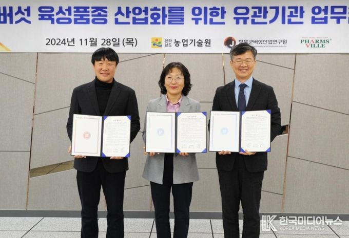 이날 협약식에는 김행란 전라남도농업기술원장, 김경제 (재)장흥군버섯산업연구원장 직무대리, 이병욱 ㈜팜스빌 대표 등이 참석했다.