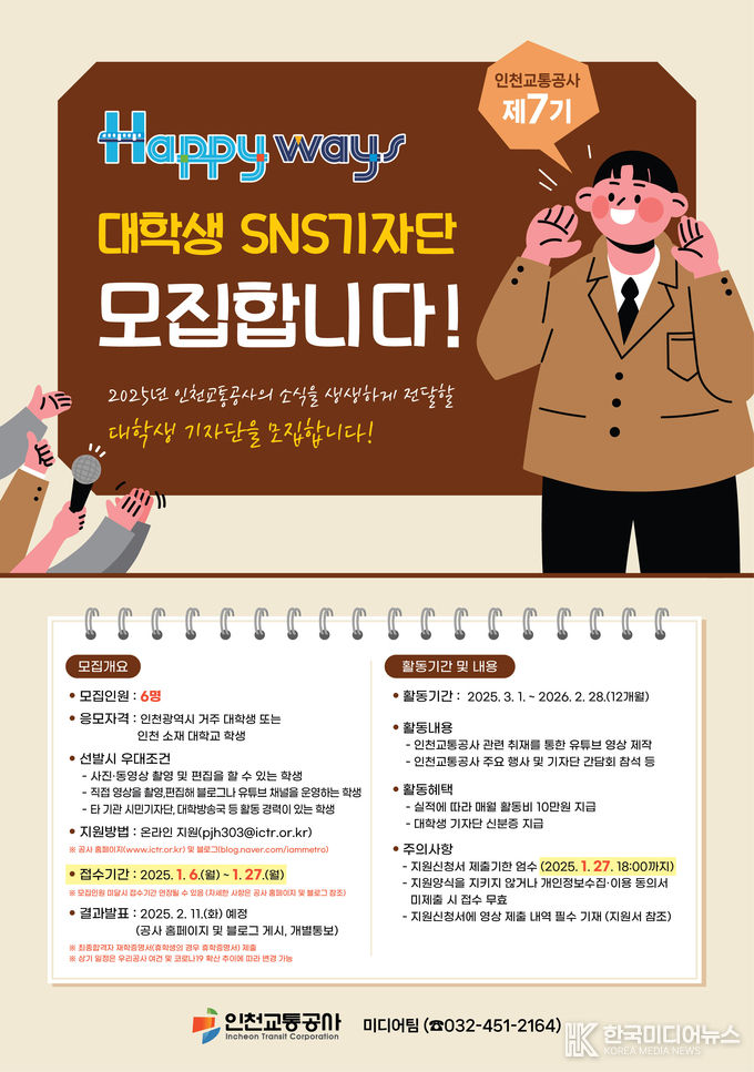 [ 한국미디어뉴스 이원영 기자 ] 인천교통공사(사장 김성완)는 대시민 소통을 위해 공사 유튜브 콘텐츠 제작할 ‘제7기 대학생 기자단’을 모집한다고 16일 밝혔다.
