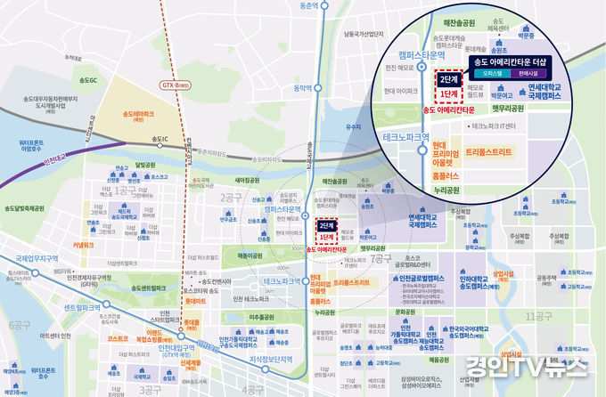 여기에 단지 인근에 연세대 국제캠퍼스를 비롯해 인천 글로벌 캠퍼스, 인하대 송도캠퍼스(예정) 등 캠퍼스타운이 형성되고 있으며, 세브란스 병원(26년 예정), 연세사이언스파크(30년 예정) 등이 조성되고 있어 산학연병 첨단 클러스터가 구축될 것으로 기대된다.