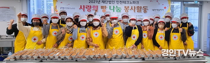 인천TP 직원 20여 명은 지난 29일 연수구 대한적십자사 인천지사 희망나눔봉사센터에서 파운드 케이크와 쿠키 등을 손수 만들어 중증장애인 시설과 홀몸노인, 보육시설 어린이에게 전달했다. 재료비는 인천TP가 모두 부담했다.