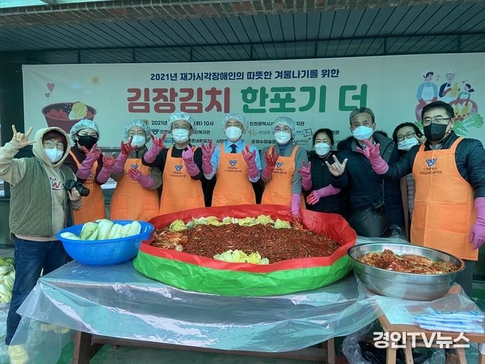 [ 경인TV뉴스 김선근 기자 ] 인천광역시시각장애인복지관(관장 이춘노)에 국제바로병원, 국민은행 경인 인천신문, 공존네트워크, 시민정책자문단, 영화공간주안, 혜성디자인, s4컴퍼니, 오페라움함께 모여 재가시각장애인 가정을 위한 김장김치 담그는 행사를 가졌다고 30일 밝혔다.