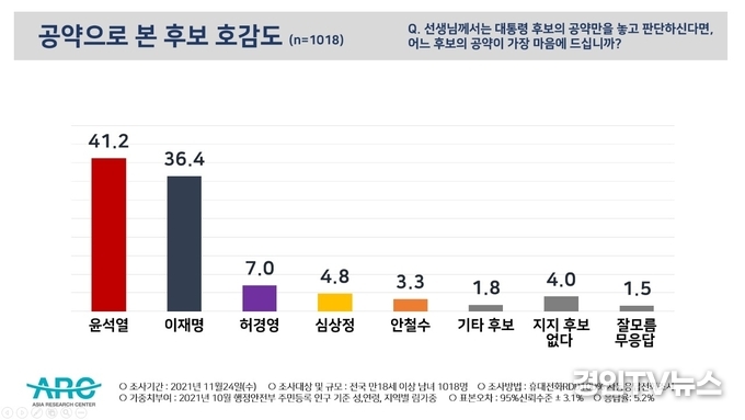 대선 공약으로 본 호감도 조사에서도 윤석열 후보 41.2%, 이재명 후보 36.4%로 양강구도가 유지되고 있다. 뒤이어 허경영 7.0%, 심상정 4.8%, 안철수 3.3%로 집계된 것이다.대통령이 된다면 대선공약을 가장 잘 이행할 것 같은 후보를 묻는 질문에선 윤석열 40.3%, 이재명 37.5%, 허경영 5.3% 안철수 4.8% 심상정 4.4%로 나타났다.