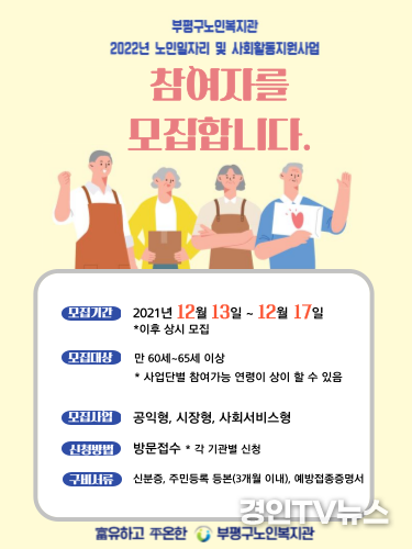 [ 경인TV뉴스 김선근 기자 ] 인천 부평구노인복지관(관장 최민수)은 2022년 노인일자리사업 참여자 모집을 2021년 12월 6일부터 17일 (10일)까지 공익활동형 사업과 시장형 사업 등 9개 사업단 1,000명을 모집한다고 밝혔다.
