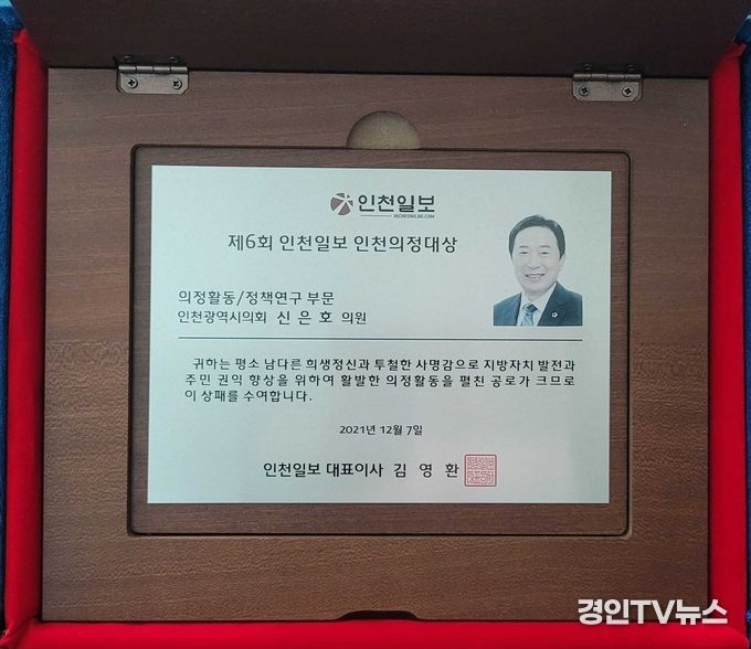 신은호 의장은 인천의정대상을 준비해 주신 인천일보 김영환 대표님과 관계자분들께 감사드립니다ㆍ