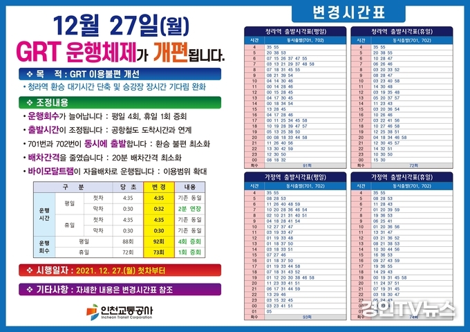 인천경제자유구역청은 청라 GRT 운영 과정에서 파악된 시민 불편 사항과 문제점을 해결하기 위해 위탁대행 사업자인 인천교통공사와 협력, GRT 1단계 노선인 701번, 702번의 운행개선(안)을 마련하고 운행계통 변경과 주민홍보를 거쳐 오는 27일 첫 차부터 시행한다고 16일 밝혔다.