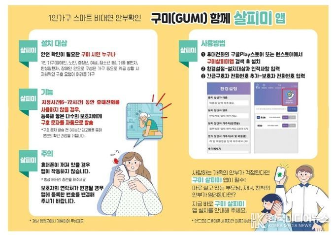 ‘구미함께 살피미 앱’은 일상 속에서 휴대전화 이용(화면터치, 버튼조작 등) 상태를 감지하여 미이용시(6~72시간 지정) 사전 등록된 보호자에게 문자 메시지를 자동 발송하여 알리는 생활안전 플랫폼이다.