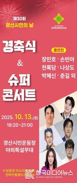 조현일 경산시장은 “이번 슈퍼콘서트는 경산시 시·군 통합 30주년을 기념하는 뜻깊은 자리이자, 아이 키우기 좋은 도시 경산의 비전을 시민과 함께 나누는 축제의 장”이라며, “세대와 가족이 함께 어우러지는 공연을 통해 저출생 문제 극복에 대한 사회적 공감대를 더욱 확산해 나가겠다”고 밝혔다.
