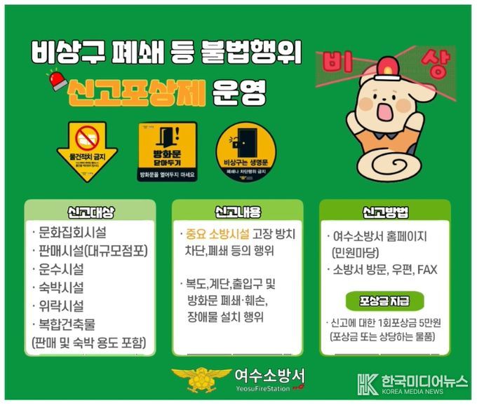 [ 한국미디어뉴스 이원영 기자 ] 여수소방서(서장 서승호)는 소방시설 및 피난·방화시설의 불법행위를 시민이 직접 신고하면 포상금을 지급하는'소방시설 등 불법행위 신고포상제'를 적극 홍보 중이라고 30일 밝혔다.