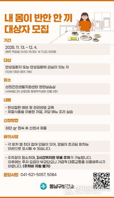 이번 프로그램은 만성질환 예방과 관리를 위해 마련됐으며, 성정건강생활지원센터 내 영양실습실에서 제철식품을 활용한 저염·저당 메뉴 조리 실습을 진행할 예정이다.