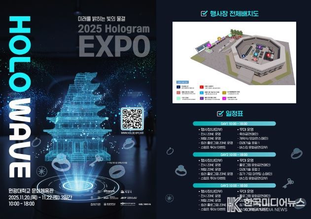 [ 한국미디어뉴스 이종철 기자 ] (재)전북특별자치도 콘텐츠융합진흥원(원장 김성규)은 ‘2025 홀로그램 엑스포 HOLO WAVE’가 오는 11월 20일부터 22일까지 3일간, 오전 10시부터 오후 6시까지 익산 원광대학교 문화체육관에서 개최된다고 밝혔다.