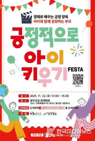 [ 한국미디어뉴스 이종철 기자 ] 완주군이 긍정적인 양육 문화의 확산을 위해 세이브더칠드런과 함께 ‘긍정적으로 아이 키우기 페스타’를 오는 22일 완주군청 문예회관에서 개최한다.