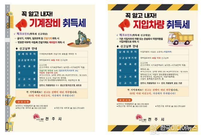 [ 한국미디어뉴스 이종철 기자 ] 전주시는 최근 지입차량 및 기계 장비 취득 후 신고 기한을 잊어버리거나 놓쳐서 가산세를 부담하는 사례가 증가함에 따라 관련 납세자의 가산세 부담을 최소화하기 위한 집중 홍보를 펼치고 있다고 12일 밝혔다.