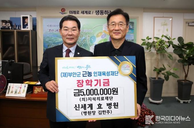 [ 한국미디어뉴스 이종철 기자 ] 의료법인 지석의료재단 신세계효병원은 지난 17일 부안군청을 방문해 부안군 근농인재육성재단(이사장 권익현)에 장학금 500만원을 기탁했다.