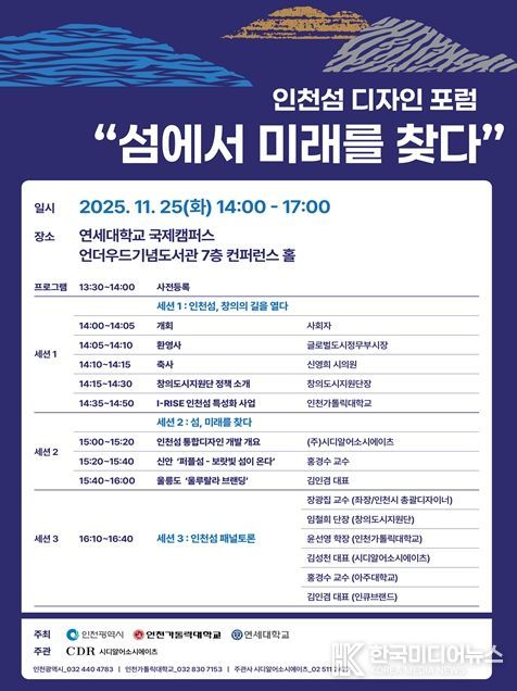 [ 한국미디어뉴스 이원영 기자 ] 인천광역시는 오는 11월 25일 연세대학교 국제캠퍼스에서『인천섬 디자인 포럼』을 개최한다고 밝혔다.