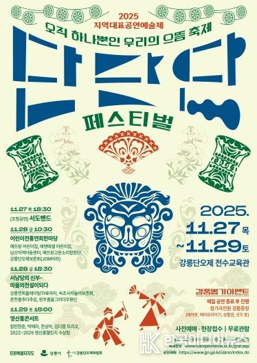 [ 한국미디어뉴스 이원영 기자 ] (사)강릉단오제위원회는 오는 11월 27일부터 29일까지 강릉단오제전수교육관 일원에서 ‘2025 단단단페스티벌’을 개최한다고 밝혔다. ‘단단단(端單團)’은 으뜸 단(端), 오직 하나 단(單), 우리 단(團)을 뜻하며 “오직 하나뿐인 우리의 으뜸 축제”를 의미한다.