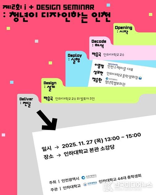 [ 한국미디어뉴스 이원영 기자 ] 인천광역시는 오는 11월 27일 오후 1시 인하대학교 소강당에서 ‘제2회 아이플러스(i+) 디자인 세미나 : 청년이 디자인하는 인천’을 개최한다고 밝혔다.