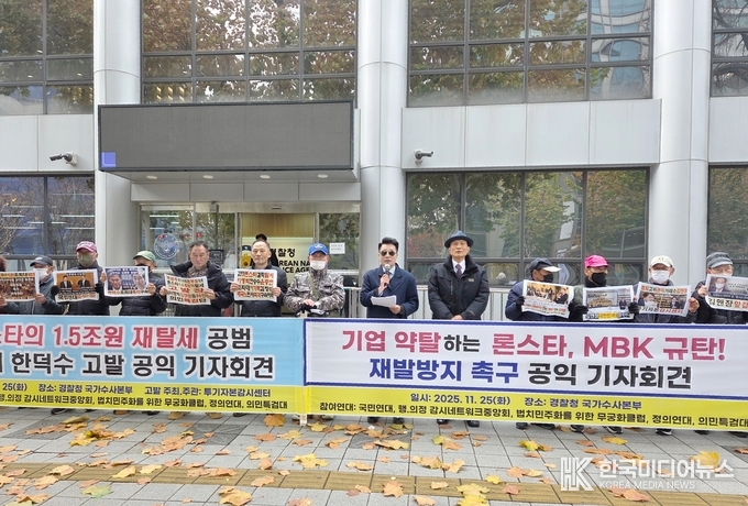 25일, 행·의정 감시네트워크 중앙회 등 여러 시민단체는 경찰청 국가수사본부 앞에서 기자회견을 열고, 론스타와 사모펀드 MBK파트너스의 경제 약탈 행위를 규탄했다.