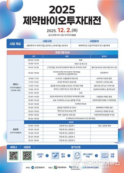 [ 한국미디어뉴스 이원영 기자 ] 인천광역시가 주최하고 인천관광공사와 KOTRA, 한국제약바이오협회가 공동 주관하는 ‘제약바이오투자대전’이 오는 12월 2일 인천 송도컨벤시아 프리미어볼룸에서 열린다.