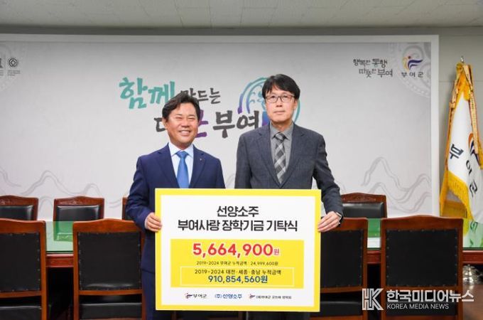 [ 한국미디어뉴스 이원영 기자 ] ㈜선양소주는 지난 26일 부여군청을 방문하여 인재 육성을 위한 장학금 566여만 원을 (재)부여군굿뜨래장학회에 기탁했다.