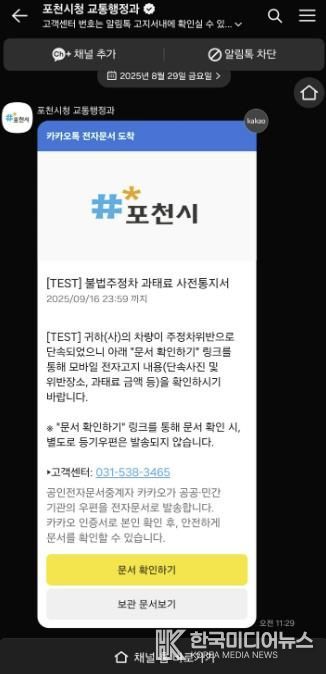 [ 한국미디어뉴스 김서안 기자 ] 포천시는 2026년부터 불법주정차 과태료 사전통지서를 카카오톡 기반 전자고지 방식으로 전면 전환한다.