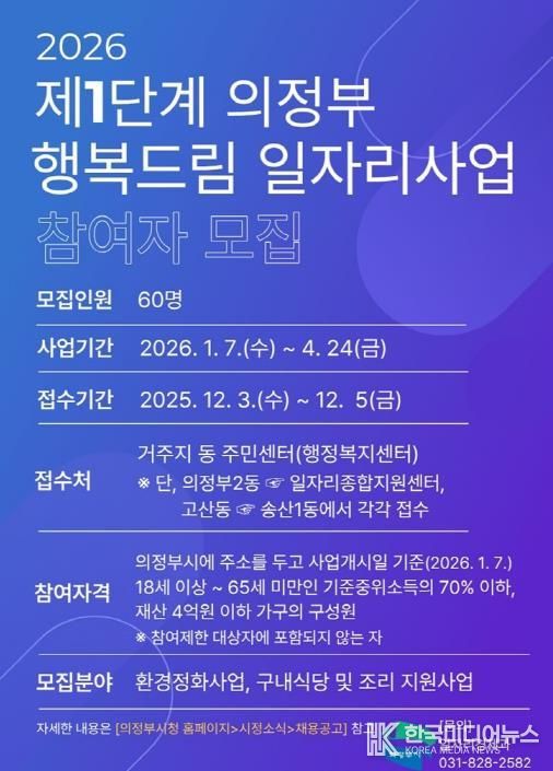 [ 한국미디어뉴스 김서안 기자 ] 의정부시는 12월 3일부터 5일까지 ‘2026년 제1단계 의정부 행복드림 일자리사업’ 참여자 60명을 모집한다.