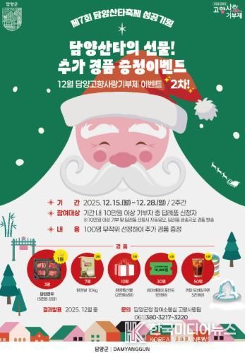 [ 한국미디어뉴스 이종철 기자 ] 담양군이 연말을 맞아 12월 15일부터 28일까지 2주간 ‘담양산타의 선물! 고향사랑기부 추가 경품 증정 이벤트’를 실시한다.