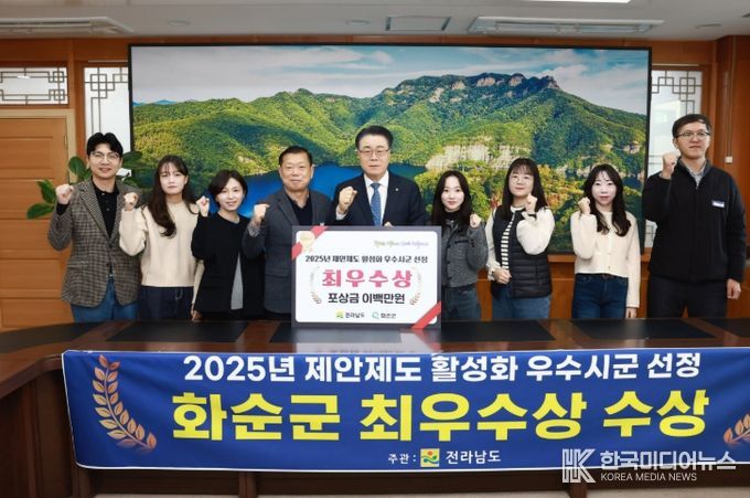 [ 한국미디어뉴스 이종철 기자 ] 화순군은 18일 전라남도에서 주관한 ‘2025년 제안제도 활성화 평가’에서 최우수상을 받았다고 밝혔다.