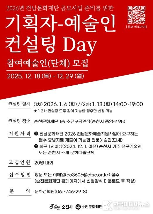 [ 한국미디어뉴스 이종철 기자 ] (재)순천문화재단은 오는 29일까지 ‘2026 기획자-예술인 컨설팅 Day(이하 컨설팅 Day)’에 참여할 전문예술인(단체)을 공개 모집한다.
