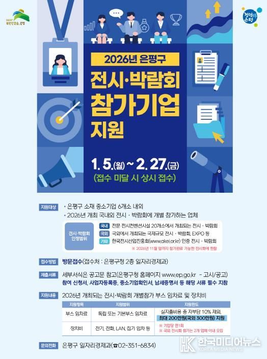 [ 한국미디어뉴스 이보영 기자 ] 서울 은평구는 내달 27일까지 ‘2026년 국내외 전시‧박람회 개별 참가 지원사업’에 참여할 기업을 모집한다고 밝혔다.