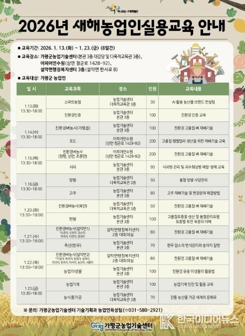 [ 한국미디어뉴스 김서안 기자 ] 가평군농업기술센터가 농업인의 영농 역량 강화를 위해 ‘2026년 새해농업인실용교육’을 오는 1월 13일부터 23일까지 실시한다.