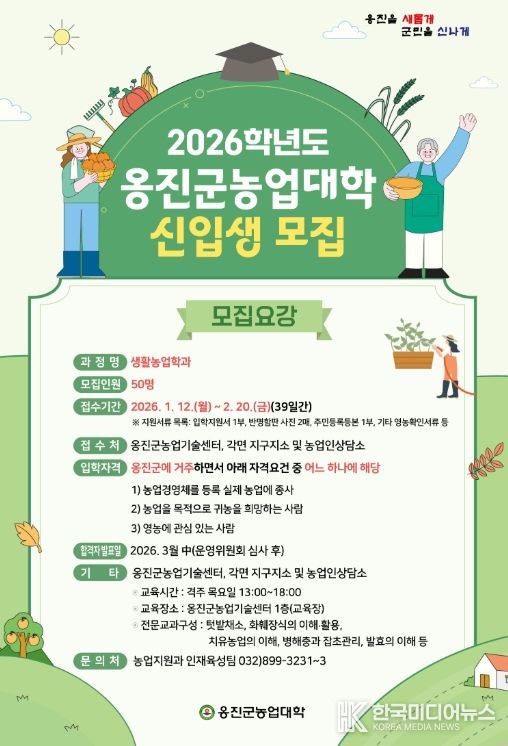[ 한국미디어뉴스 이원영 기자 ] 옹진군은 2026학년도 옹진군농업대학(생활농업학과) 신입생을 오는 12일부터 2월 20일까지 모집한다고 9일 밝혔다.