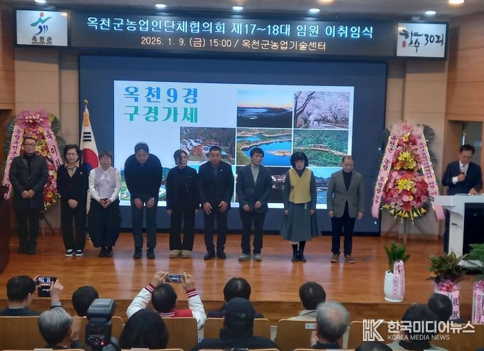 [ 한국미디어뉴스 김풍옥 기자 ] 옥천군농업인단체협의회(회장 황동연)가 지난 9일 농업기술센터 농업인교육관에서 회원 및 내빈 100여명이 참여한 가운데 제17‧18대 회장 이‧취임식을 개최했다.
