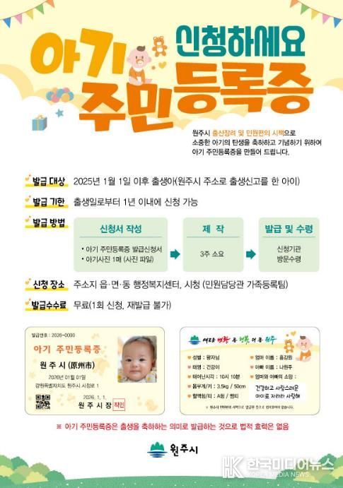 [ 한국미디어뉴스 이원영 기자 ] 원주시는 출산 장려 및 민원 편의를 위해 ‘아기주민등록증’ 무료 발급 사업을 올해도 지속해서 추진한다.
