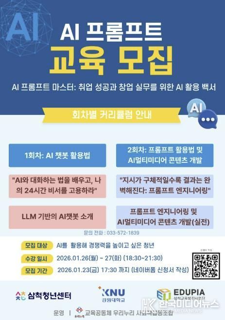 삼척청년센터 관계자는 “AI 기술을 단순한 정보 습득 도구가 아닌 청년들의 취업과 창업 경쟁력을 높이는 실질적 역량으로 연결하기 위해 이번 교육을 마련했다”며 “AI 활용에 관심 있는 시민들의 많은 참여를 기대한다”고 말했다.