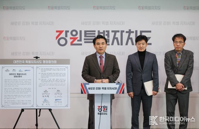 [ 한국미디어뉴스 이원영 기자 ] 강원, 제주, 세종, 전북으로 구성된 ‘대한민국특별자치시도 행정협의회’(대표회장 : 김진태 강원특별자치도지사)는 1월 21일 4개 특별자치시‧도의 특별법안 조속한 통과와 광역 행정통합 인센티브 부여에 따른 역차별 우려를 담은 공동성명서를 발표했다.