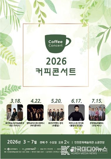 [ 한국미디어뉴스 이원영 기자 ] 인천문화예술회관(관장 홍순미)이 간판 브랜드 공연 〈커피콘서트'의 2026년 상반기 출연진을 공개한다.