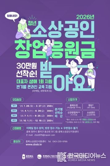 [ 한국미디어뉴스 김풍옥 기자 ] 충북도와 (재)충청북도기업진흥원(소상공인지원센터)이 ‘2026년 청년 소상공인 창업응원금 지원사업’의 1분기 참여자 250명을 1월 26일부터 오는 3월 27일까지 선착순으로 모집한다.