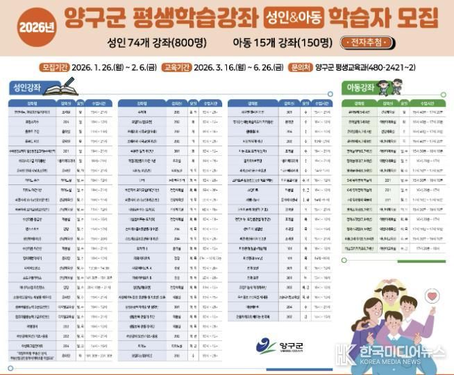 [ 한국미디어뉴스 이원영 기자 ] 양구군은 1월 26일부터 2월 6일까지 12일간 상반기 평생교육 프로그램 학습자를 모집한다.