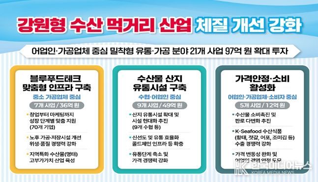 [ 한국미디어뉴스 이원영 기자 ] 강원특별자치도는 수산 먹거리 산업을 단순 생산 중심 구조에서 벗어나 가공·유통·소비로 이어지는 블루푸드테크(Blue Food-Technology) 산업화와 연계해 총 21개 사업, 97억 원 규모의 종합 지원책을 본격 추진한다.