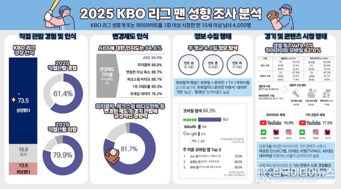 [ 한국미디어뉴스 황영수 기자 ] KBO는 2025 KBO 리그에 대한 팬 인식과 소비 행태를 분석하기 위해 전문 조사업체인 ㈜글로벌리서치를 통해 온라인 팬 성향 조사를 실시했다. 본 조사는 KBO 리그 생중계 또는 하이라이트를 1회 이상 시청한 만 15세 이상 남녀 4,000명을 대상으로 진행됐다.