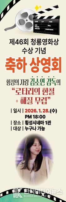 [ 한국미디어뉴스 이원영 기자 ] 횡성문화원은 제46회 청룡영화상 청정원 단편영화상 수상자인 김소연 감독을 초청해, 오는 1월 28일(수) 오후 6시부터 횡성시네마 1관에서 ‘청룡영화상 수상 기념 축하 상영회’를 개최한다.